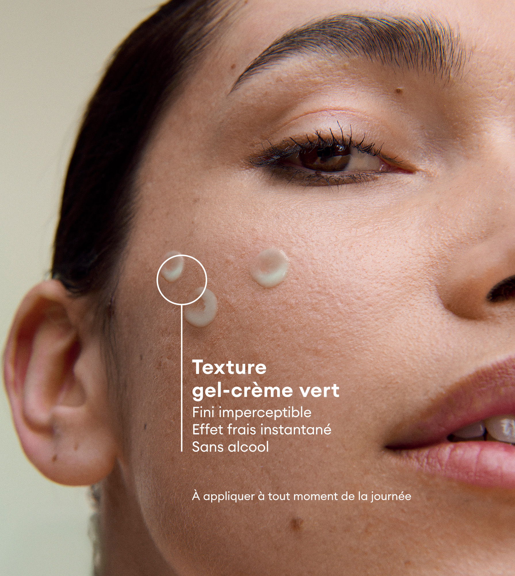 Its green cooling gel-cream dries in seconds with an invisible finish, perfect under or over makeup.