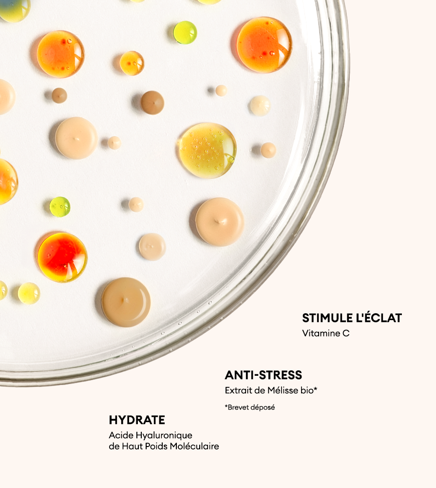 Furthermore, the combination of Vitamin C, Hyaluronic Acid, and an exclusive organic Melissa extract (PATYKA patented*) re-energizes, hydrates, and protects the skin from daily stressors.
