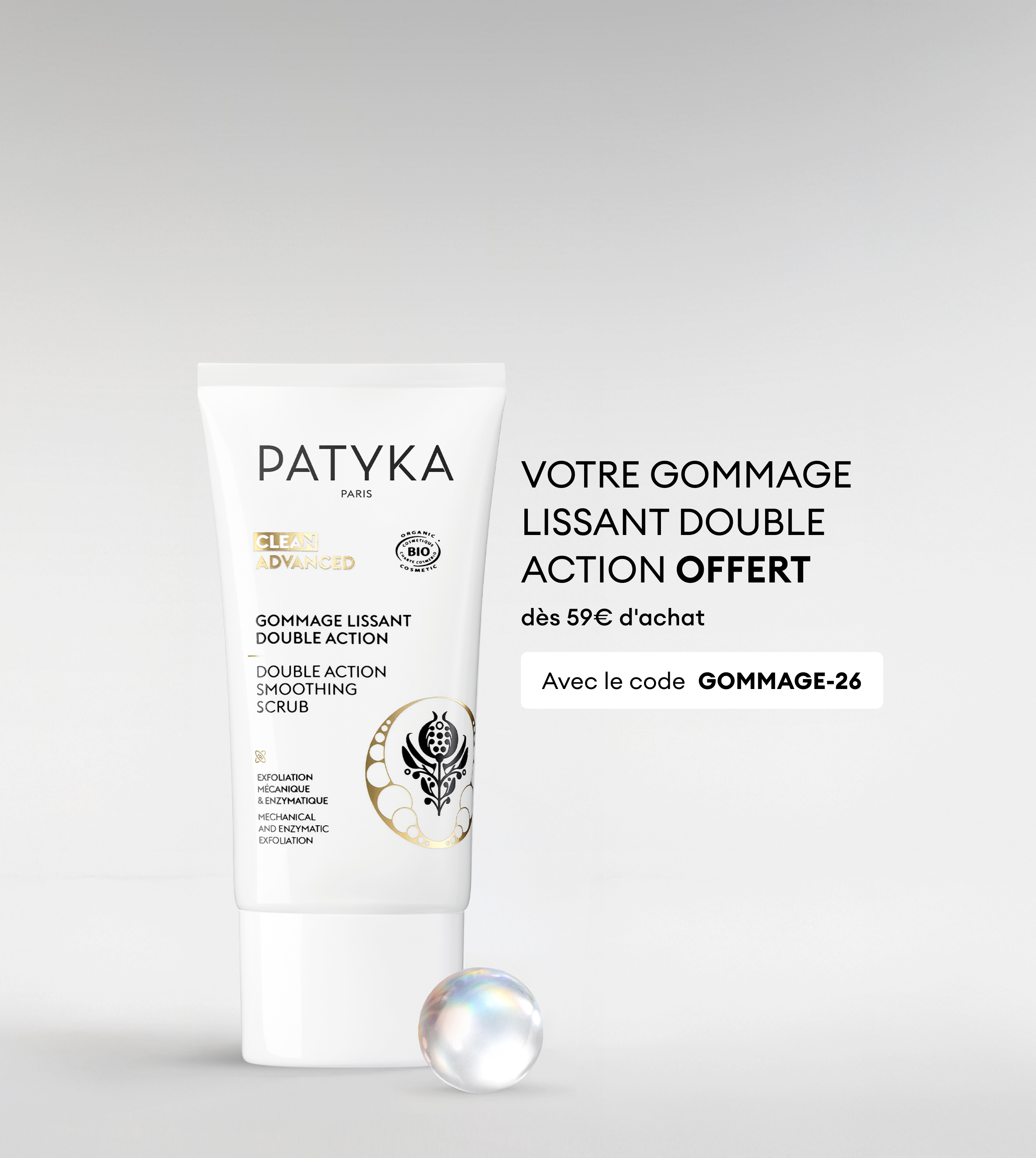Le Gommage Lissant Double Action est un gommage multifonctions qui combine une exfoliation enzymatique à une exfoliation mécanique pour une efficacité renforcée.
